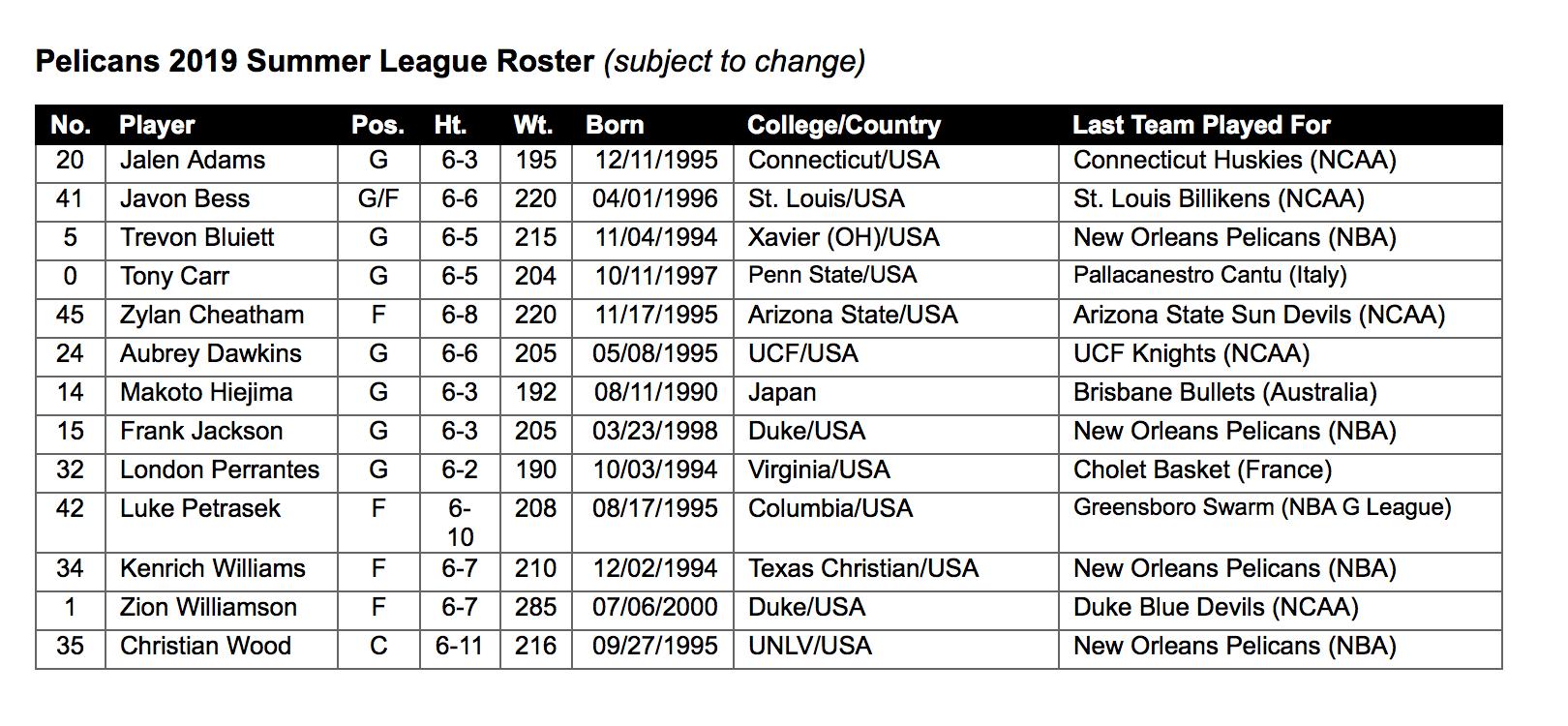 New Orleans Pelicans Summer League Roster; Starting 5 from images2.minutemediacdn.com There are a lot of young players with potential as well as a few solid veterans. The complete new orleans pelicans team roster, with player salaries and latest news updates. Updated new orleans pelicans roster for the 2020 nba season. Player roster with photos, bios, and stats. In a season fast going sideways, steven adams remains as reliable as ever for pelicans. Clubhouse · news · roster · patch · statistics · depth chart · units · ratings · schedule · salaries · transactions · nba stats · tbt. Visit espn to view the new orleans pelicans team roster for the current season. Quick access to players bio, career stats and team records.